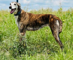 Hero “Comet” – a female greyhound-mix. Her birthdate is 12-6-2012, so her age is 11. Weight is 56 pounds.