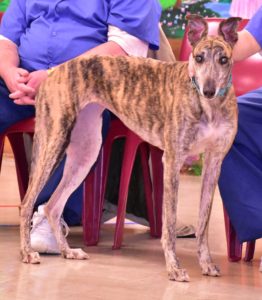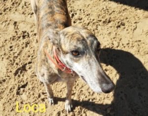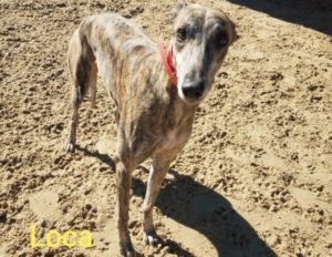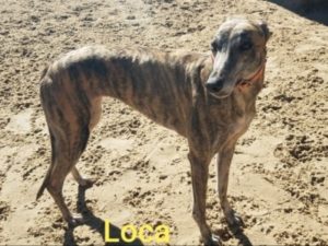 Loca (Ultra Loca) – female, brindle, born Sept. 12, 2016. A petite 64#. Tattoos 96B-69615.